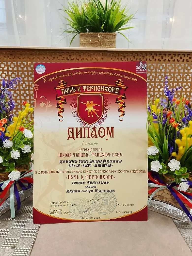 Школа танцев «Танцуют все!» Комплексного центра социального обслуживания населения «Кежемский» завоевала диплом 1 степени в конкурсе «Путь к Терпсихоре»! 🌟💃🕺 Это событие стало настоящим праздником грации, упорства и любви к искусству. Наши участники продемонстрировали не только технику, но и невероятную волю к победе, доказав, что для творчества и успеха нет границ! ❤️💪 Выход на такую сцену и высокая оценка жюри — это результат долгих репетиций, мастерства педагогов и, конечно, искренней страсти самих артистов. Мы гордимся тем, что в нашем Центре зажигаются такие яркие звезды! 💫👏 Благодарим организаторов за высокий уровень конкурса, а наших танцоров — за вдохновение и веру в себя. Впереди — новые горизонты и еще более высокие вершины! 🚀🏅