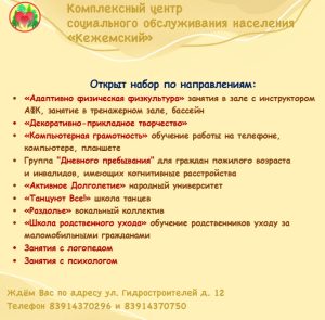 Внимание❗ В Комплексном центре социального обслуживания населения, в социально-реабилитационном отделении, для граждан пенсионного возраста и лиц с ограниченными возможностями идет набор в группы по всем направлениям.