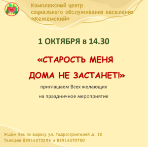 🍁1 октября в 14:30🍁, приглашаем Всех желающих на праздничное мероприятие «Старость меня дома не застанет!», который будет проходить в Комплексном центре социального обслуживания населения «Кежемский».